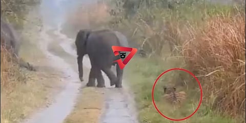 ಬೆಂಗಳೂರು: ದಾರಿಯಲ್ಲಿ ಹೋಗುತ್ತಿದ್ದಾಗ ದಿಢೀರನೆ ಬಂದ ಆನೆಗಳ ಹಿಂಡಿಗೆ ಹುಲಿಯೊಂದು ದಾರಿ ಮಾಡಿಕೊಟ್ಟಿರುವ ಘಟನೆ ನಡೆದಿದ್ದು, ಪ್ರಾಣಿಪ್ರಿಯರೊಬ್ಬರು ಈ ವಿಡಿಯೋವನ್ನು ಸೆರೆ ಹಿಡಿದಿದ್ದಾರೆ.