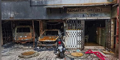ಮುಂಬೈನ ಗೋರೆಗಾಂವ್ ಪ್ರದೇಶದ ಬಹುಮಹಡಿ ವಸತಿ ಕಟ್ಟಡದಲ್ಲಿ ಬೆಂಕಿ ಕಾಣಿಸಿಕೊಂಡ ನಂತರ ವಾಹನಗಳು ಸುಟ್ಟು ಕರಕಲಾಗಿವೆ