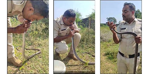 ಭೋಪಾಲ್: ಸಿಂಪಡಿಸಿದ್ದ ರಾಸಾಯನಿಕ ಕೀಟನಾಶಕ ವಾಸನೆಗೆ ಪ್ರಜ್ಞೆ ತಪ್ಪಿ ಬಿದಿದ್ದ ಹಾವಿಗೆ ಪೊಲೀಸ್ ಸಿಬ್ಬಂದಿಯೊಬ್ಬರು ತಮ್ಮ ಬಾಯಿಂದ ಕೃತಕ ಉಸಿರಾಟ ನೀಡಿ ಜೀವ ಉಳಿಸಿರುವ ಅಪರೂಪದ ಘಟನೆ ಮಧ್ಯಪ್ರದೇಶ (Madhya Pradesh)ದಲ್ಲಿ ನಡೆದಿದೆ.