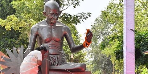 ನವದೆಹಲಿ: ರಾಷ್ಟ್ರಪತಿ ದ್ರೌಪದಿ ಮುರ್ಮು ಅವರು ಸೋಮವಾರ ದೆಹಲಿಯ ರಾಜ್ಘಾಟ್ನಲ್ಲಿ ಮಹಾತ್ಮ ಗಾಂಧಿಯವರ 12 ಅಡಿ ಎತ್ತರದ ಪ್ರತಿಮೆಯನ್ನು ಅನಾವರಣಗೊಳಿಸಿದರು.