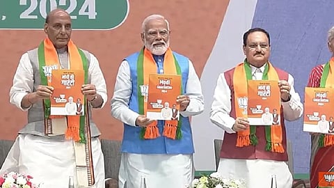 ನವದೆಹಲಿ: ಲೋಕಸಭೆ ಚುನಾವಣೆಯ ಮೊದಲ ಹಂತದ ಮತದಾನಕ್ಕೆ ಇನ್ನು ಕೇವಲ ಐದು ದಿನಗಳು ಬಾಕಿ ಉಳಿದಿರುವಾಗ, ಭಾರತೀಯ ಜನತಾ ಪಕ್ಷವು ತನ್ನ ಚುನಾವಣಾ ಪ್ರಣಾಳಿಕೆಯನ್ನು ಭಾನುವಾರ ಬಿಡುಗಡೆ ಮಾಡಿದ್ದು "ಮೋದಿ ಕಿ ಗ್ಯಾರಂಟಿ" ಎಂಬ ಅಡಿಬರಹದೊಂದಿಗೆ ದೇಶದ ಅಭಿವೃದ್ಧಿ, ಮಹಿಳಾ ಕಲ್ಯಾಣ ಮತ್ತು "ವಿಕ್ಷಿತ್ ಭಾರತ್" (ಅಭಿವೃದ್ಧಿ ಹೊಂದಿದ ಭಾರತ)ದ ಮಾರ್ಗಸೂಚಿಗಳೊಂದಿಗೆ ಜನತೆಯ ಮುಂದೆ ನೀಡಿದೆ.