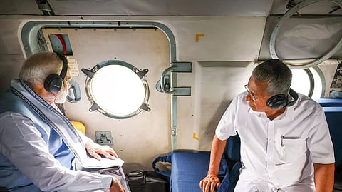 ಭಾರತೀಯ ವಾಯುಪಡೆಯ ಹೆಲಿಕಾಪ್ಟರ್ನಲ್ಲಿ ಭೂಕುಸಿತದಿಂದ ಹಾನಿಗೊಂಡ ಚೂರಲ್ಮಲಾ, ಮುಂಡಕ್ಕೈ ಮತ್ತು ಪುಂಚಿರಿಮಟ್ಟಂ ಗ್ರಾಮಗಳನ್ನು ವೀಕ್ಷಿಸಿದರು.