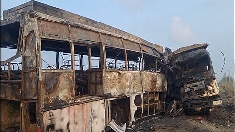 ಪಲ್ನಾಡು(ಆಂಧ್ರ ಪ್ರದೇಶ): ಬಸ್ಸು ಲಾರಿಗೆ ಡಿಕ್ಕಿ ಹೊಡೆದ ರಭಸಕ್ಕೆ ಬಸ್ಸು ಸಂಪೂರ್ಣ ಹೊತ್ತಿ ಉರಿದು ಆರು ಮಂದಿ ಸಜೀವ ದಹನವಾದ ಪ್ರಕರಣ ಆಂಧ್ರ ಪ್ರದೇಶದ ಪಲ್ನಾಡು ಜಿಲ್ಲೆಯಲ್ಲಿ ಬುಧವಾರ ನಸುಕಿನ ಜಾವ ನಡೆದಿದೆ.