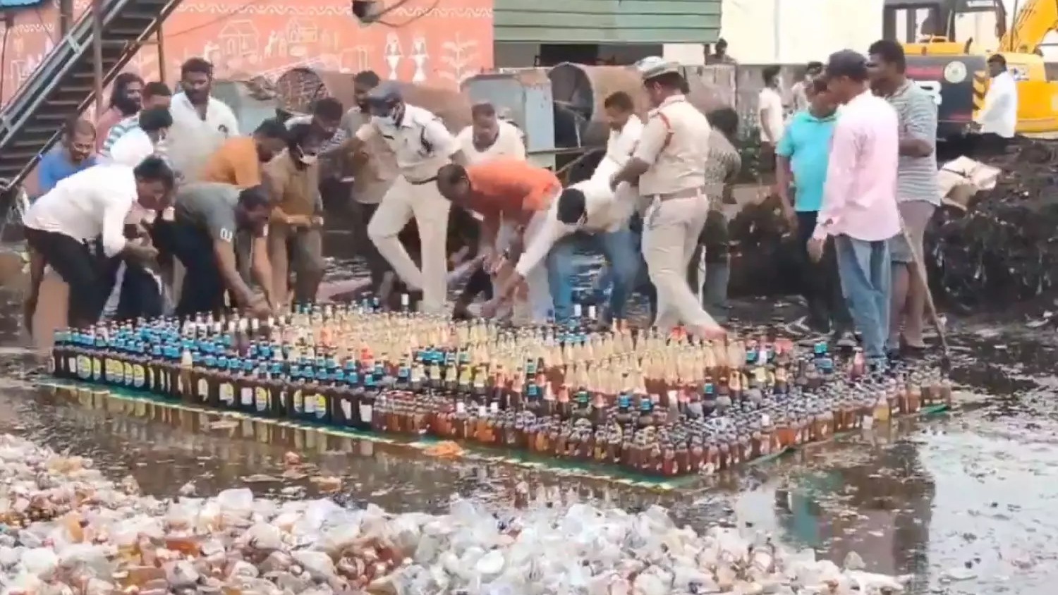 ಆಂಧ್ರ ಪ್ರದೇಶದ ಗುಂಟೂರು ಜಿಲ್ಲೆಯ ಡಂಪಿಂಗ್ ಯಾರ್ಡ್ನಲ್ಲಿ ಪೊಲೀಸರು ವಶಪಡಿಸಿಕೊಂಡಿದ್ದ ಅಕ್ರಮ ಮದ್ಯವನ್ನು ನಾಶಪಡಿಸುವ ವೇಳೆ ಅದನ್ನು ನೋಡಿ ಸಹಿಸಲಾಗದ ಮದ್ಯಪ್ರಿಯರು ಓಡೋಡಿ ಬಂದು ಮದ್ಯದ ಬಾಟಲಿ ಹಿಡಿದು ಓಡಿದ್ದಾರೆ.