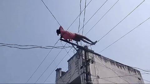 ಅಷ್ಟು ಹೊತ್ತಿಗಾಗಲೇ ಯುವಕ ವಿದ್ಯುತ್ ಕಂಬ ಏರಿ, ಹೈಟೆನ್ಷನ್ ವೈರ್ ಮೇಲೆ ಮಲಗಿದ್ದಾನೆ. ಅದೃಷ್ಟವಶಾತ್ ವಿದ್ಯುತ್ ಸರಬರಾಜನ್ನು ಗ್ರಾಮಸ್ಥರು ಸ್ಥಗಿತಗೊಳಿಸಿದ್ದರಿಂದ ಯುವಕ ವಿದ್ಯುತ್ ಆಘಾತದಿಂದ ಪಾರಾಗಿದ್ದಾನೆ,