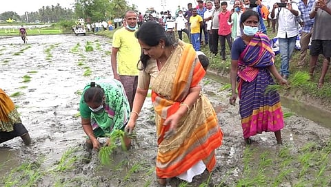 ಬೆಂಗಳೂರು: ಜನಾಶೀರ್ವಾದ ಯಾತ್ರೆ ಕೈಗೊಂಡಿರುವ ಕೇಂದ್ರ ಕೃಷಿ ಮತ್ತು ರೈತ ಕಲ್ಯಾಣ ಖಾತೆ ರಾಜ್ಯ ಸಚಿವೆ ಶೋಭಾ ಕರಂದ್ಲಾಜೆ ಸೋಮವಾರ ಮಂಡ್ಯ ಜಿಲ್ಲೆಯ ಗ್ರಾಮವೊಂದರಲ್ಲಿ ಗದ್ದೆ ನಾಟಿ ಮಾಡಿ ಗಮನ ಸೆಳೆದರು. ರೈತ ಮಹಿಳೆಯರ ಜೊತೆ ಗದ್ದೆಗೆ ಇಳಿದ ಶೋಭಾ 5 ನಿಮಿಷಗಳ ಕಾಲ ನಾಟಿ ಮಾಡಿದರು.