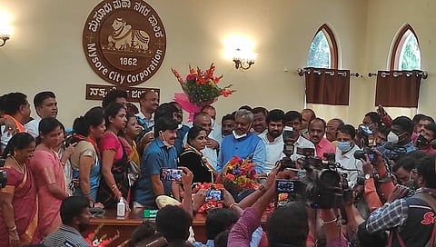 ಮೈಸೂರು: ಇಬ್ಬರ ಜಗಳ ಮೂರನೆಯವರಿಗೆ ಲಾಭ ಎನ್ನುವಂತೆ ಕಾಂಗ್ರೆಸ್-ಜೆಡಿಎಸ್ ನ ಜಗಳದಿಂದ ಬಿಜೆಪಿಗೆ ಲಾಭವಾಗಿ ಮೇಯರ್ ಪಟ್ಟ ಮೊದಲ ಬಾರಿಗೆ ಬಿಜೆಪಿ ಪಾಲಾಗಿದೆ. ಈ ಮೂಲಕ ಮೈಸೂರು ಮಹಾನಗರ ಪಾಲಿಕೆ ಮೇಯರ್ ಸ್ಥಾನದ ಇತಿಹಾಸದಲ್ಲಿ ಕಮಲ ಅರಳಿದೆ.