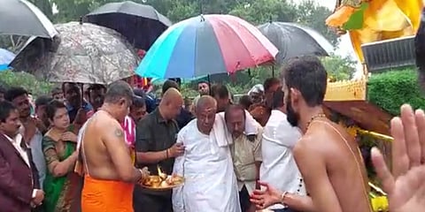 ಮೂಡಣಬಾಗಿಲು ಕುರುಡು ಮಲೆಯ ಗಣಪತಿಗೆ ಭಾರೀ ಮಳೆ ನಡುವೆ ಹೋಮ, ಪೂಜೆ ಸಲ್ಲಿಸಿ ಜೆಡಿಎಸ್ ಮಹತ್ವಾಕಾಂಕ್ಷೆಯ ಪಂಚರತ್ನ ರಥಯಾತ್ರೆ ಹಾಗೂ ಚುನಾವಣಾ ಪ್ರಚಾರಕ್ಕೆ ಪಕ್ಷದ ರಾಷ್ಟ್ರೀಯ ಅಧ್ಯಕ್ಷ ಹೆಚ್. ಡಿ. ದೇವೇಗೌಡ ಅವರು ಅಧಿಕೃತವಾಗಿ ಚಾಲನೆ ನೀಡಿದರು.