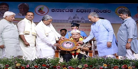 ಬೆಳಗಾವಿ: ರಾಜ್ಯ ಕರ್ನಾಟಕ" ಎಂದು ನಾಮಕರಣಗೊಂಡು 50 ವರ್ಷವಾದ ಹಿನ್ನೆಲೆಯಲ್ಲಿ ಆಯೋಜಿಸಲಾಗಿದ 'ಸುವರ್ಣ ಮಹೋತ್ಸವದಲ್ಲಿ' ಕರ್ನಾಟಕ ವಿಧಾನ ಮಂಡಲದ ಮಾಜಿ ಸಭಾಧ್ಯಕ್ಷರು ಹಾಗೂ ಸಭಾಪತಿಗಳನ್ನು ಮಂಗಳವಾರ ಸನ್ಮಾನಿಸಲಾಯಿತು.