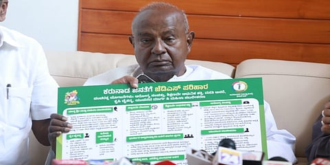 ಬೆಂಗಳೂರು: ಕರ್ನಾಟಕ ವಿಧಾನಸಭೆ ಚುನಾವಣೆಗೆ ಮುನ್ನ ಮಾಜಿ ಪ್ರಧಾನಿ ಹಾಗೂ ಹಿರಿಯ ಜೆಡಿಎಸ್ ನಾಯಕ ಎಚ್.ಡಿ. ದೇವೇಗೌಡರು ಶನಿವಾರ ಬೆಂಗಳೂರಿನಲ್ಲಿ 12 ಅಂಶಗಳ ಪಕ್ಷದ ಪ್ರಣಾಳಿಕೆಯನ್ನು ಬಿಡುಗಡೆ ಮಾಡಿದರು. ಇದರಲ್ಲಿ ಪಕ್ಷವು ಮಹಿಳಾ ಸಬಲೀಕರಣ ಮತ್ತು ರೈತರ ಅಭಿವೃದ್ಧಿಗೆ ಒತ್ತು ನೀಡಿದೆ.