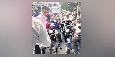 ಬೆಂಗಳೂರು: ಚಿಕ್ಕಪೇಟೆಯ ಸಜ್ಜನ್ ರಾವ್ ವೃತ್ತದಲ್ಲಿ ಬುಧವಾರ ಸಂಜೆ 4 ಗಂಟೆಗೆ ಆಮ್ ಆದ್ಮಿ ಪಕ್ಷದ ಪರ ಪ್ರಚಾರ ನಡೆಸುತ್ತಿದ್ದ ಸುಮಾರು 50 ಮಂದಿ ವಿಕಲಚೇತನ ಆಪ್ ಬೆಂಬಲಿಗರನ್ನು ಚುನಾವಣಾ ಆಯೋಗದ ಫ್ಲೈಯಿಂಗ್ ಸ್ಕ್ವಾಡ್ ಅಧಿಕಾರಿ ಕೇಶವ ವಿಸಿ ಅವರು ತಡೆದು ನಿಲ್ಲಿಸಿದ್ದಾರೆ.