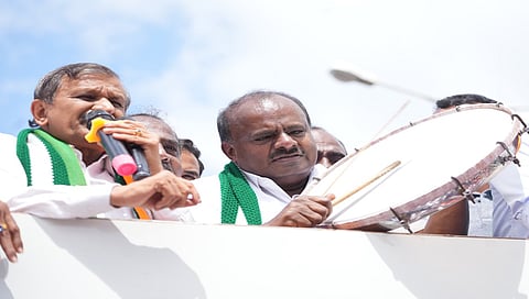 ಮುಡಾ ಹಗರಣ ಹಿನ್ನೆಲೆಯಲ್ಲಿ ರಾಜ್ಯ ಸರ್ಕಾರದ ವಿರುದ್ಧ ಆಯೋಜಿಸಿರುವ 'ಮೈಸೂರು ಚಲೋ' ಪಾದಯಾತ್ರೆಯ ಎರಡನೇ ದಿನವಾದ ಇಂದು ಬಿಜೆಪಿ ಹಾಗೂ ಜೆಡಿಎಸ್ ಕಾರ್ಯಕರ್ತರನ್ನುದ್ದೇಶಿಸಿ ಮಾತನಾಡಿದ ಕುಮಾರಸ್ವಾಮಿ, ಮುಂದಿನ ದಿನಗಳಲ್ಲಿ ಬಿಜೆಪಿ-ಜೆಡಿಎಸ್ ಸಮ್ಮಿಶ್ರ ಸರ್ಕಾರವನ್ನು ಮರಳಿ ತರುವ ನಿಟ್ಟಿನಲ್ಲಿ ಕೆಲಸ ಮಾಡುತ್ತೇನೆ. ಯಾರು ಮುಖ್ಯಮಂತ್ರಿಯಾಗಬೇಕು ಎಂಬುದು ನನಗೆ ಮುಖ್ಯವಲ್ಲ. ಬಿಜೆಪಿ ಮತ್ತು ಜೆಡಿಎಸ್ ಕಾರ್ಯಕರ್ತರು ಒಟ್ಟಾಗಿ ಕೆಲಸ ಮಾಡಬೇಕು ಎಂದು ಮನವಿ ಮಾಡಿದರು. ಎರಡು ಬಾರಿ ರಾಜ್ಯದ ಮುಖ್ಯಮಂತ್ರಿ ಆಗಿದ್ದೇನೆ. ನನಗೆ ರಾಜ್ಯ ಮತ್ತು ಜನರ ಕಲ್ಯಾಣ ಮತ್ತು ಅಭಿವೃದ್ಧಿ ಮುಖ್ಯ ಎಂದರು.