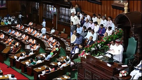 ಅಧಿವೇಶನದ ಮೊದಲ ದಿನದವಾದ ಇಂದು ರಾಜ್ಯಪಾಲರು ಸದನವನ್ನು ಉದ್ದೇಶಿಸಿ ಭಾಷಣ ಮಾಡಿದರು. ಭಾಷಣ ಮುಗಿಸಿ ರಾಜ್ಯಪಾಲರು ಜೈ ಹಿಂದ್​, ಜೈ ಕರ್ನಾಟಕ, ಧನ್ಯವಾದ ಎಂದು ಹೇಳುತ್ತಿದ್ದಂತೆ ಬಿಜೆಪಿ ಸದಸ್ಯರು ಜೈ ಶ್ರೀ ರಾಮ್​ ಎಂದು ಘೋಷಣೆ ಕೂಗಿದರು. ಅಷ್ಟರಲ್ಲಿ ರಾಷ್ಟ್ರಗೀತೆ ಮೊಳಗಿತು. ರಾಷ್ಟ್ರಗೀತೆ ಮುಗಿಯುತ್ತಿದ್ದಂತೆ ರಾಜ್ಯಪಾಲ ಥಾವರ್​ ಚಂದ್​ ಗೆಹ್ಲೋಟ್​, ವಿಧಾನಸಭೆ ಅಧ್ಯಕ್ಷ ಯು.ಟಿ.ಖಾದರ್​, ವಿಧಾನ ಪರಿಷತ್​ ಸಭಾಪತಿ ಬಸವರಾಜ ಹೊರಟ್ಟಿ, ಮುಖ್ಯಮಂತ್ರಿ ಸಿದ್ದರಾಮಯ್ಯ, ಕಾನೂನು ಸಚಿವ ಎಚ್​. ಕೆ.ಪಾಟೀಲ್​ ಅವರು ಸಭೆಯಿಂದ ನಿರ್ಗಮಿಸಿದರು.