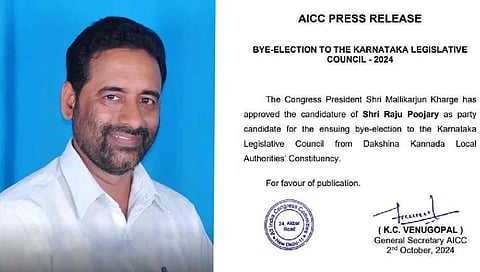 ವಿಧಾನ ಪರಿಷತ್ ಉಪಚುನಾವಣೆಗೆ ರಾಜು ಪೂಜಾರಿ ಬೈಂದೂರು ಅವರು ಕಾಂಗ್ರೆಸ್ ಅಭ್ಯರ್ಥಿ ಎಂದು ಎಐಸಿಸಿ ಪ್ರಧಾನ ಕಾರ್ಯದರ್ಶಿ ಕೆಸಿ ವೇಣುಗೋಪಾಲ್ ಅವರು ಅಧಿಕೃತ ಘೋಷಣೆ ಮಾಡಿದ್ದಾರೆ.