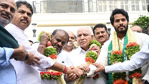 ಇಂದು ಬಿಎಸ್ ಯಡಿಯೂರಪ್ಪ ಅವರ ನಿವಾಸದಲ್ಲಿಂದು ನಡೆದ ಜೆಡಿಎಸ್-ಬಿಜೆಪಿ ನಾಯಕರ ಸಮನ್ವಯ ಸಭೆ ಬಳಿಕ ಕೇಂದ್ರ ಸಚಿವ ಎಚ್ ಡಿ ಕುಮಾರಸ್ವಾಮಿ ಅವರೊಂದಿಗೆ ಜಂಟಿ ಸುದ್ದಿಗೋಷ್ಠಿಯನ್ನು ಉದ್ದೇಶಿಸಿ ಮಾತನಾಡಿದ ಬಿಎಸ್ ಯಡಿಯೂರಪ್ಪ ಅವರು, ಚನ್ನಪಟ್ಟಣ ಕ್ಷೇತ್ರದಲ್ಲಿ ಎನ್ಡಿಎ ಅಭ್ಯರ್ಥಿಯಾಗಿ ನಿಖಿಲ್ ಸ್ಪರ್ಧಿಸುತ್ತಾರೆ ಎಂದು ಘೋಷಿಸಿದರು.