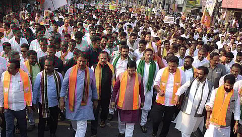 ಬಳಿಕ ಪ್ರಲ್ಹಾದ್ ಜೋಶಿ ಮತ್ತಿತರ ನಾಯಕರ ನೇತೃತ್ವದಲ್ಲಿ ಪ್ರತಿಭಟನಾ ಮೆರವಣಿಗೆ ನಡೆಯಿತು. ಸಾವಿರಾರು ಬಿಜೆಪಿ ಕಾರ್ಯಕರ್ತರು ಈ ಮೆರವಣಿಗೆಯಲ್ಲಿ ಪಾಲ್ಗೊಂಡರು. ಪ್ರತಿಭಟನಾ ಸ್ಥಳಕ್ಕೆ ಆಗಮಿಸುವ ಮುನ್ನಾ ಪ್ರಲ್ಹಾದ್ ಜೋಶಿ ಮತ್ತಿತರ ನಾಯಕರು ಚಾಮುಂಡೇಶ್ವರ ಬೆಟ್ಟಕ್ಕೆ ತೆರಳಿ ವಿಶೇಷ ಪ್ರಾರ್ಥನೆ ಸಲ್ಲಿಸಿದರು.