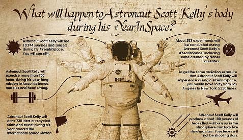 "ಗಗನಯಾತ್ರಿ ಸ್ಕಾಟ್ ಕೆಲ್ಲಿ ಒಂದು ವರ್ಷದ ಬಾಹ್ಯಾಕಾಶ ಯಾನದಲಿ ೧೦೯೪೪ ಸೂರ್ಯಾಸ್ತ ಮತ್ತು ಸೂರ್ಯೋದಯಗಳನ್ನು ನೋಡಲಿದ್ದಾರೆ. ನೀವು ೬೮೪ ಬಾರಿ ನೋಡಲಿದ್ದೀರಿ" ಎಂದು ನಾಸಾ ತಿಳಿಸಿದೆ.