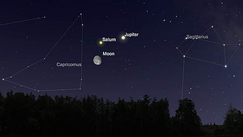 ನಿನ್ನೆ ಆಕಾಶದಲ್ಲಿ ಗುರು ಮತ್ತು ಚಂದ್ರರು ಸಂಯೋಜಿಸಿದ್ದವು. ಅದು ಶನಿ ಮತ್ತು ಚಂದ್ರ ಒಟ್ಟಿಗೆ ಬರುವ ಕೆಲವೇ ಗಂಟೆಗಳ ಮುನ್ನವಾಗಿತ್ತು. ನಿನ್ನೆ ಮತ್ತು ಮೊನ್ನೆ ಈ ಅಪರೂಪದ ವಿದ್ಯಮಾನಗಳು ನಡೆದಿದ್ದರೆ ಇಂದು ಮೂರೂ ಗ್ರಹಗಳು ಸಂಯೋಜಿಸಿ ತ್ರಿಕೋನ ರಚಿಸಲಿವೆ.