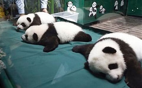 ಬೀಜಿಂಗ್: ಇಡೀ ವಿಶ್ವದಲ್ಲಿ ಬೀಜಿಂಗ್ ನಲ್ಲಿ ಮಾತ್ರ ಬದುಕುಳಿರುವ ಈ ದೈತ್ಯ ಪಾಂಡಾ 'ತ್ರಿವಳಿ' ಗಳಿಗೆ ಈಗ ೧೦೦ ದಿನ ತುಂಬಿದೆ.