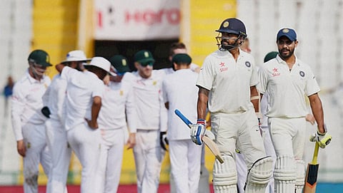 ಇಲ್ಲಿನ ಪಂಜಾಬ್ ಕ್ರಿಕೆಟ್ ಸಂಸ್ಥೆ (ಪಿಸಿಎ) ಮೈದಾನದಲ್ಲಿ ಶುರುವಾದ ಗಾಂಧಿ-ಮಂಡೇಲಾ ಟೆಸ್ಟ್ ಸರಣಿಯ ಮೊದಲ ಪಂದ್ಯದಲ್ಲಿ ಆರಂಭಿಕವು ಮುರಳಿ ವಿಜಯ್ (75: 136 ಎಸೆತ , 12 ಬೌಂಡರಿ ) ದಾಖಲಿಸಿದ ಅರ್ಧಶತಕದ ನೆರವಿನೊಂದಿಗೆ ಭಾರತ ತನ್ನ ಮೊದಲ ಇನ್ನಿಂಗ್ಸ್ ನಲ್ಲಿ 68 ಓವರ್ ಗಳಲ್ಲಿ 201 ರನ್ಗೆ ಆಲೌಟ್ ಆದರೆ, ಇದಕ್ಕೆ ಪ್ರತಿಯಾಗಿ ದ.ಆಫ್ರಿಕಾ ಕೂ ಡ 20 ಓವರ್ ಗಳಲ್ಲಿ 28 ರನ್ ಗೆ 2 ವಿಕೆಟ್ ಕಳೆದುಕೊಂಡು ಚಡಪಡಿಸಿದೆ. ಸ್ಪಿನ್ಮಯವಾಗಿದ್ದ ಪಿಚ್ನ ಲಾಭ ಪಡೆದ ಡೀನ್ ಎಲ್ಗಾರ್ (22ಕ್ಕೆ 4) ತೋರಿದ ಚಾಣಾಕ್ಷ ಪ್ರದರ್ಶನದಿಂದ ಆತಿಥೇಯರನ್ನು ಅಲ್ಪಮೊತ್ತಕ್ಕೆ ಕಟ್ಟಿಹಾಕಿದ ದ.ಆಫ್ರಿಕಾ, ಎಚ್ಚರಿಕೆಯಿಂದ ಇನ್ನಿಂಗ್ಸ್ ಕಟ್ಟಲು ಮುಂದಾದರೂ, ಅದರಲ್ಲಿ ವಿಫಲವಾಯಿತು. ಆರಂಭಿಕ ಸ್ಟಿಯಾನ್ ವಾನ್ ಜಿಲ್ (5) ಅವರನ್ನು ಆರ್. ಅಶ್ವಿನ್ ಬಲಿಪಡೆದರೆ, ಸೀಮಿತ ಓವರ್ಗಳ ಸರಣಿಯಲ್ಲಿ ಪ್ರಚಂಡ ಪ್ರದರ್ಶನ ನೀಡಿದ್ದ ಫ್ಯಾಪ್ ಡು ಪ್ಲೆಸಿಸ್ ಅವರನ್ನು ಶೂನ್ಯಕ್ಕೆ ಬೌಲ್ಡ್ ಮಾಡಿದ ರವೀಂದ್ರ ಜಡೇಜಾ, ಪ್ರವಾಸಿಗರನ್ನು ಒತ್ತಡಕ್ಕೆ ಸಿಲುಕಿಸುವಲ್ಲಿ ಯಶಸ್ವಿಯಾದರು.