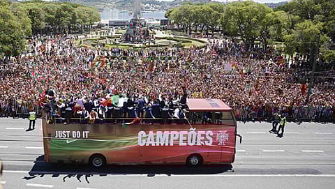 ಆಟಗಾರರನ್ನು ಹೊತ್ತಿದ್ದ ವಿಶೇಷ ವಿಮಾನ ಪೋರ್ಚಗಲ್ ರಾಜಧಾನಿ ಲಿಸ್ಬನ್ ನಲ್ಲಿ ಇಳಿಯುತ್ತಿದ್ದಂತೆಯೇ ಪೋರ್ಚಗಲ್ ರಾಷ್ಟ್ರಧ್ವಜ ಬಣ್ಣವನ್ನು ವಿಮಾನದ ಮೇಲೆ ಹಾರಿಸುವ ಮೂಲಕ ಅಭೂತಪೂರ್ವ ಸ್ವಾಗತ ನೀಡಲಾಯಿತು. ಬಳಿಕ ವಿಮಾನ ನಿಲ್ದಾಣದದಿಂದ ಇಳಿದ ಆಟಗಾರರನ್ನು ವಿಶೇಷ ಬಸ್ ನಲ್ಲಿಕೂರಿಸಿಕೊಂಡು ಹೋಗಲಾಯಿತು. ಈ ವೇಳೆ ನಡೆದ ರೋಡ್ ಶೋನಲ್ಲಿ ಸುಮಾರು 5 ಸಾವಿರಕ್ಕೂ ಅಧಿಕ ಪ್ರೇಕ್ಷಕರು ರಸ್ತೆಬದಿಗಳಲ್ಲಿ ನೆರೆದು ಅಟಗಾರರನ್ನು ಅಭಿನಂದಿಸಿದರು. ತೆರೆದ ವಾಹನದಲ್ಲಿ ಆಟಗಾರರನ್ನು ಕಂಡ ಅಭಿಮಾನಿಗಳು ಘೋಷ ವಾಕ್ಯಗಳನ್ನು ಕೂಗುವ ಮೂಲಕ ಆಟಗಾರರನ್ನು ಹುರಿದುಂಬಿಸಿದ್ದಷ್ಟೇ ಅಲ್ಲದೇ, ಟ್ರೋಫಿಯನ್ನು ಕಣ್ತುಂಬಿಕೊಂಡರು.