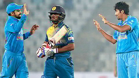 ಏಷ್ಯಾಕಪ್ ಟಿ20 ಟೂರ್ನಿಯ ತನ್ನ 3ನೇ ಪಂದ್ಯದಲ್ಲಿ ಟಿ20 ವಿಶ್ವ ಚಾಂಪಿಯನ್ ಶ್ರೀಲಂಕಾ ವಿರುದ್ಧ 5 ವಿಕೆಟ್ ಗೆಲುವು ಸಾಧಿಸಿದ ಧೋನಿ ಬಳಗ ಟೂರ್ನಿಯಲ್ಲಿ ಪ್ರಶಸ್ತಿ ಹಂತಕ್ಕೇರಿದ ಮೊದಲ ತಂಡವೆನಿಸಿಕೊಂಡಿದೆ. ಶೇರ್-ಎ-ಬಾಂಗ್ಲಾ ಸ್ಟೇಡಿಯಂನಲ್ಲಿ ಮಂಗಳವಾರ ನಡೆದ ಪಂದ್ಯದಲ್ಲಿ ಟಾಸ್ ಸೋತು ಮೊದಲು ಬ್ಯಾಟಿಂಗ್ ಮಾಡಿದ ಶ್ರೀಲಂಕಾ 9 ವಿಕೆಟ್ಗೆ 138 ರನ್ ಗಳಿಸಲಷ್ಟೇ ಶಕ್ತವಾಯಿತು. ಶ್ರೀಲಂಕಾದ ಮಧ್ಯಮ ಕ್ರಮಾಂಕದ ಬ್ಯಾಟ್ಸಮನ್ ಕಪುಗಡೆರಾ ಗಳಿಸಿದ 30 ರನ್ ಗಳೇ ಶ್ರೀಲಂಕಾದ ಪರ ವೈಯುಕ್ತಿಕ ಅತ್ಯಧಿಕ ರನ್ ಆಗಿತ್ತು.