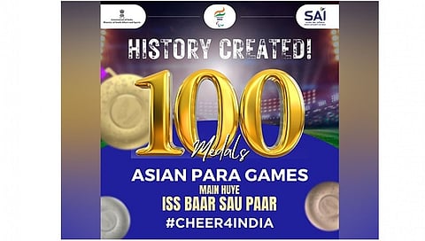 ಹ್ಯಾಂಗ್ಝೌ: ಚೀನಾದ ಹ್ಯಾಂಗ್ಝೌನಲ್ಲಿ ನಡೆಯುತ್ತಿರುವ ಏಷ್ಯನ್ ಪ್ಯಾರಾ ಗೇಮ್ಸ್ನಲ್ಲಿ ಭಾರತ ಹೊಸ ದಾಖಲೆ ಬರೆದಿದೆ. 100 ಪದಕಗಳನ್ನು ಗೆಲ್ಲುವ ಮೂಲಕ ಪ್ಯಾರಾ ಅಥ್ಲೀಟ್ಸ್ಗಳು ಇತಿಹಾಸದ ಪುಟದಲ್ಲಿ ಅಚ್ಚೊತ್ತಿದ್ದಾರೆ.