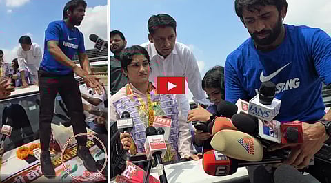 ಭವ್ಯ ಸ್ವಾಗತ ಸಮಾರಂಭದ ಭಾಗವಾಗಿ ವಿನೇಶ್ ಫೋಗಟ್ ಅವರನ್ನು ಸ್ವಾಗತಿಸಲು ಸಹ ಭಾರತೀಯ ಕುಸ್ತಿಪಟುಗಳಾದ ಸಾಕ್ಷಿ ಮಲಿಕ್ ಮತ್ತು ಬಜರಂಗ್ ಪುನಿಯಾ ವಿಮಾನ ನಿಲ್ದಾಣದಲ್ಲಿ ಉಪಸ್ಥಿತರಿದ್ದರು. ವಿನೇಶ್ ಅವರ ಭವ್ಯ ಸ್ವಾಗತದ ನಡುವೆ ಕಾರಿನ ಮೇಲೆ ಅಳವಡಿಸಿದ್ದ 'ತಿರಂಗಾ' ಪೋಸ್ಟರ್ ಮೇಲೆ ಬಜರಂಗ್ ಪುನಿಯಾ ನಿಂತಿರುವುದು ವಿವಾದಕ್ಕೆ ಕಾರಣವಾಗಿದೆ.