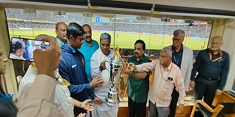 ಬೆಂಗಳೂರು: ಇತ್ತೀಚಿಗೆ ಶಿವಮೊಗ್ಗದಲ್ಲಿ ನಡೆದ ಕೂಚ್ ಬೆಹಾರ್ ಟ್ರೋಫಿ ಕ್ರಿಕೆಟ್ ಪಂದ್ಯದಲ್ಲಿ 404 ರನ್ ಗಳಿಸಿ 19 ವರ್ಷದೊಳಗಿನ ಕರ್ನಾಟಕ ತಂಡ ಗೆಲುವಿನಲ್ಲಿ ಪ್ರಮುಖ ಪಾತ್ರ ವಹಿಸಿದ್ದ ಪ್ರತಿಭಾವಂತ ಆಟಗಾರ ಪ್ರಖರ್ ಚತುರ್ವೇದಿ ಅವರನ್ನು ಮುಖ್ಯಮಂತ್ರಿ ಸಿದ್ದರಾಮಯ್ಯ ಬುಧವಾರ ಚಿನ್ನಸ್ವಾಮಿ ಕ್ರೀಡಾಂಗಣದಲ್ಲಿ ಅಭಿನಂದಿಸಿದರು.