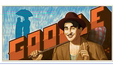 ಹಳೇ ಕಾಲದ ಹ್ಯಾಂಡ್ ಪ್ರಿಂಟೆಡ್ ಫಿಲ್ಮ್ ಪೋಸ್ಟರ್ ಮಾಡಿ ಅದರಲ್ಲಿ ನಗುತ್ತಿರುವ ರಾಜ್ ಕಪೂರ್. ಈ ಚಿತ್ರದ ಹಿನ್ನೆಲೆಯಲ್ಲಿ ಶ್ರೀ 420ರಲ್ಲಿ ರಾಜ್ ಕಪೂರ್ ನರ್ಗೀಸ್ ಜತೆ ಕೊಡೆ ಹಿಡಿದು ಸಾಗುವ ದೃಶ್ಯವನ್ನು ಹಿಡಿದಿಟ್ಟು ಡೂಡಲ್ ರಚಿಸಲಾಗಿದೆ.