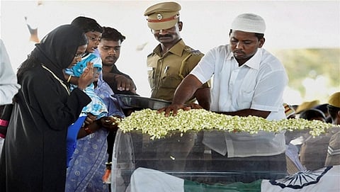 ದೆಹಲಿಯಲ್ಲಿ ಗಣ್ಯರ ಅಂತಿಮ ನಮನದ ಬಳಿಕ ಇಂದು ಬೆಳಗ್ಗೆ ಕಲಾಂ ಅವರ ಪಾರ್ಥಿವ ಶರೀರವನ್ನು ಹೊತ್ತ ವಿಶೇಷ ವಿಮಾನ ಪಾಲಂ ವಿಮಾನ ನಿಲ್ದಾಣದಿಂದ ತಮಿಳುನಾಡಿನ ಮದುರೈ ಆಗಮಿಸಿತ್ತು. ಅಲ್ಲಿಂದ ವಿಶೇಷ ಹೆಲಿಕಾಪ್ಟರ್ ಮೂಲಕ ರಾಮನಾಥಪುರಂ ಜಿಲ್ಲೆಯ ರಾಮೇಶ್ವರಂಗೆ ತರಲಾಗಿದೆ.