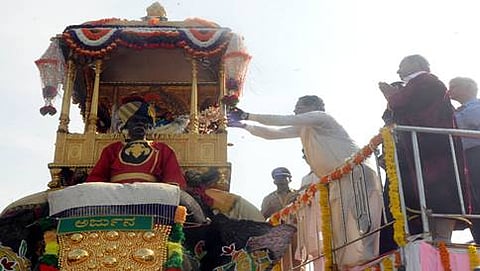 ಇದಕ್ಕೂ ಮೊದಲು ಅಂಬಾವಿಲಾಸ ಅರಮನೆಯ ಉತ್ತರದಲ್ಲಿರುವ ಬಲರಾಮ ದ್ವಾರದಲ್ಲಿ ಇಂದು ಮಧ್ಯಾಹ್ನ 12.07ರಿಂದ 12.21ರವರೆಗೆ ಸಲ್ಲುವ ಧನುರ್ ಲಗ್ನದಲ್ಲಿ ಸಿಎಂ ಸಿದ್ದರಾಮಯ್ಯ ಅವರು ನಂದಿ ಧ್ವಜಕ್ಕೆ ಪೂಜೆ ಸಲ್ಲಿಸಿದರು. ಬಳಿಕ ಮಧ್ಯಾಹ್ನ 12.30ರಿಂದ ಆರಂಭವಾಗುವ ಮಕರ ಲಗ್ನದಲ್ಲಿ ಚಿನ್ನದ ಅಂಬಾರಿಯಲ್ಲಿ ನಾಡದೇವತೆ ಮತ್ತು ಮೈಸೂರು ಅರಸರ ಅಧಿದೇವತೆ ಶ್ರೀ ಚಾಮುಂಡೇಶ್ವರಿಗೆ ಪುಷ್ಪಾರ್ಚನೆ ಮಾಡುವ ಮೂಲಕ ವಿಜಯದಶಮಿ ಮೆರವಣಿಗೆಗೆ ಚಾಲನೆ ನೀಡಿದರು.