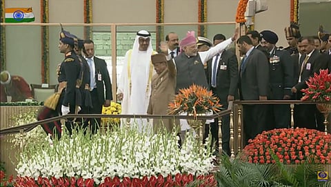 ನವದೆಹಲಿ: ರಾಷ್ಟ್ರರಾಜಧಾನಿ ದೆಹಲಿಯಲ್ಲಿ ನಡೆದ 68ನೇ ಗಣರಾಜ್ಯೋತ್ಸವ ಸಂಭ್ರಮಾಚರಣೆಗೆ ರಾಷ್ಟ್ರಗೀತೆಯನ್ನು ಹಾಡುವ ಮೂಲಕ ವರ್ಣ ರಂಜಿತ ತೆರೆ ಎಳೆಯಲಾಗಿದ್ದು, ರಾಷ್ಟ್ರಪತಿ ಪ್ರಣಬ್ ಮುಖರ್ಜಿ ಹಾಗೂ ಕಾರ್ಯಕ್ರಮಕ್ಕೆ ಮುಖ್ಯ ಅತಿಥಿಯಾಗಿದ್ದ ಶೇಖ್ ಮೊಹಮ್ಮದ್ ಬಿನ್ ಜಾಯೇದ್ ಅವರಿಗೆ ಪ್ರಧಾನಿ ನರೇಂದ್ರ ಮೋದಿ ಆತ್ಮೀಯ ಬೀಳ್ಕೊಡುಗೆ ನೀಡಿದರು.