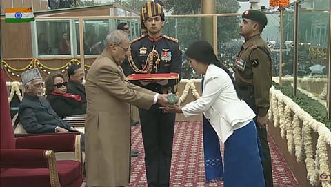 ದೆಹಲಿ ರಾಜ್ ಪಥ್ ನಿರ್ಮಿಸಲಾಗಿರುವ ವಿಶೇಷ ವೇದಿಕೆಗೆ ಆಗಮಿಸಿದ ರಾಷ್ಟ್ರಪತಿ ಪ್ರಣಬ್ ಮುಖರ್ಜಿ ಅವರು, ತ್ರಿವರ್ಣ ಧ್ವಜಾರೋಹಣ ಮಾಡಿದರು. ಈ ವೇಳೆ ಗಡಿಯಲ್ಲಿ ತಮ್ಮ ಶೌರ್ಯ ಪ್ರದರ್ಶನ ಮಾಡಿ 3 ಉಗ್ರರನ್ನು ಹತ್ಯೈಗೈದಿದ್ದ ಹುತಾತ್ಮ ಯೋಧ ಹವಾಲ್ದಾರ್ ಹಂಗಪನ್ ದಾದಾ ಅವರಿಗೆ ಅಶೋಕ ಚಕ್ರ ಪ್ರಶಸ್ತಿ ಪ್ರಧಾನ ಮಾಡಲಾಯಿತು. ಹಂಗಪನ್ ದಾದಾ ಅವರ ಪತ್ನಿ ಅವರಿಗೆ ರಾಷ್ಟ್ರಪತಿ ಪ್ರಣಬ್ ಮುಖರ್ಜಿ ಅವರು ಪ್ರಶಸ್ತಿ ಪ್ರದಾನ ಮಾಡಿದರು.