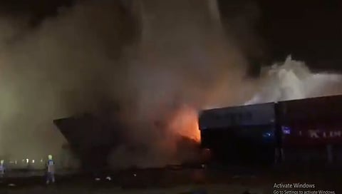 ದುಬೈ: ಅರೇಬಿಯನ್ ಪೆನಿನ್ಸುಲಾದ ಪೂರ್ವ ಭಾಗದಲ್ಲಿ ಮಧ್ಯಪ್ರಾಚ್ಯದ ಅತ್ಯಂತ ಜನನಿಬಿಡವಾದ ನಿರ್ಣಾಯಕ ಜೆಬೆಲ್ ಅಲಿ ಬಂದರಿನಲ್ಲಿರುವ ಹಡಗಿನಲ್ಲಿ ದೈತ್ಯ ಬೆಂಕಿ ಜ್ವಾಲೆಗಳು ಕಾಣಿಸಿದೆ.
