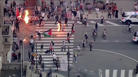 ಫಿಲಡೆಲ್ಫಿಯಾದ ಸಿಟಿ ಹಾಲ್ನ ಹೊರಗೆ ಫೆಲೆಸ್ತೀನಿಯನ್ ಪರ ಪ್ರತಿಭಟನಾಕಾರರು ಅಮೆರಿಕ ಮತ್ತು ಇಸ್ರೇಲ್ ಧ್ವಜಗಳನ್ನು ಸುಟ್ಟು ಹಾಕಿದ್ದಾರೆ. ಇಸ್ರೇಲ್ ಗಾಜಾಪಟ್ಟಿಯಲ್ಲಿ ನಡೆಯುತ್ತಿರುವ ಸಂಘರ್ಷ ಮತ್ತು ಪ್ಯಾಲೆಸ್ತೀನ್ ನಲ್ಲಿ ನಡೆಯುತ್ತಿರುವ ಸಂಘರ್ಷದ ವಿಚಾರವಾಗಿ ಪ್ಯಾಲೆಸ್ತೀನ್ ಪರ ಹೋರಾಟಗಾರರು ಫಿಲಡೆಲ್ಫಿಯಾದ ಸಿಟಿ ಹಾಲ್ನ ಹೊರಗೆ ಭಾರಿ ಪ್ರತಿಭಟನೆ ನಡೆಸಿದರು. ಸುಮಾರು 400ಕ್ಕೂ ಅಧಿಕ ಮಂದಿ ಪ್ರತಿಭಟನಾಕಾರರು ಅಮೆರಿಕದ ಧ್ವಜ ಸುಟ್ಟು ಘೋಷಣೆ ಕೂಗಿದರು.