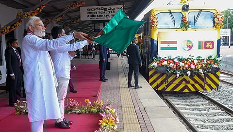 ಕೊಲಂಬೊ: ಪ್ರಧಾನಿ ನರೇಂದ್ರ ಮೋದಿ ಅವರು ಭಾನುವಾರ ಶ್ರೀಲಂಕಾದ ಐತಿಹಾಸಕ ನಗರ ಅನುರಾಧಪುರಕ್ಕೆ ಭೇಟಿ ನೀಡಿ, ಲಂಕಾ ಅಧ್ಯಕ್ಷ ಅನುರ ಕುಮಾರ ದಿಸನಾಯಕೆ ಅವರೊಂದಿಗೆ ಭಾರತದ ನೆರವಿನ ಎರಡು ಪ್ರಮುಖ ರೈಲ್ವೆ ಯೋಜನೆಗಳನ್ನು ಉದ್ಘಾಟಿಸಿದರು.