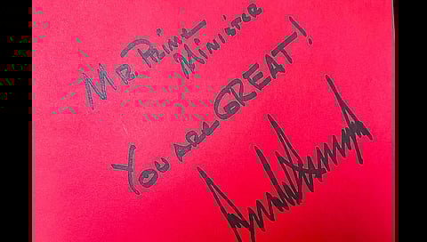 ಅಮೆರಿಕ ಅಧ್ಯಕ್ಷ ಟ್ರಂಪ್ ಅವರು ಮೋದಿಗೆ ಉಡುಗೊರೆಯಾಗಿ ನೀಡಿದ 'ಅವರ್ ಜರ್ನಿ ಟುಗೆದರ್' ಪುಸ್ತಕದಲ್ಲಿ "ಮಿಸ್ಟರ್ ಪ್ರೈಮ್ ಮಿನಿಸ್ಟರ್, ಯು ಆರ್ ಗ್ರೇಟ್" ಎಂದು ಟ್ರಂಪ್ ಬರೆದಿದ್ದಾರೆ.