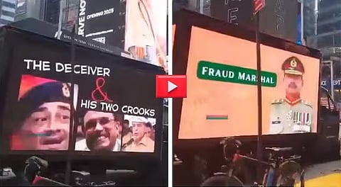 ನ್ಯೂಯಾರ್ಕ್ನ ಟೈಮ್ಸ್ ಸ್ಕ್ವೇರ್ನಲ್ಲಿ ಡಿಜಿಟಲ್ ಬಿಲ್ಬೋರ್ಡ್ನ ಪ್ರದರ್ಶನವು ಸಾಮಾಜಿಕ ಮಾಧ್ಯಮದಲ್ಲಿ ವೈರಲ್ ಆಗುತ್ತಿದೆ. ಪರದೆಯ ತುಣುಕನ್ನು ನೆಟ್ಟಿಗರು ಹಂಚಿಕೊಂಡಿದ್ದಾರೆ. ಇದರಲ್ಲಿ, ಪಾಕಿಸ್ತಾನದ ಮಿಲಿಟರಿ ಸ್ಥಾಪನೆ ಮತ್ತು ಅದರ ರಾಜಕೀಯ ನಾಯಕತ್ವವನ್ನು ಅಪಹಾಸ್ಯ ಮಾಡಲಾಗಿದೆ. ಈ ವಿಡಿಯೋವನ್ನು ಸಾಮಾಜಿಕ ಮಾಧ್ಯಮ ವೇದಿಕೆಗಳಲ್ಲಿ ವ್ಯಾಪಕವಾಗಿ ಹಂಚಿಕೊಳ್ಳಲಾಗುತ್ತಿದೆ. ಜಾಹೀರಾತು ಫಲಕವು ಪಾಕಿಸ್ತಾನ ಸೇನಾ ಮುಖ್ಯಸ್ಥ ಜನರಲ್ ಅಸಿಮ್ ಮುನೀರ್ ಅವರನ್ನು ವಂಚಕ ಮತ್ತು ಸುಳ್ಳುಗಾರ ಎಂದು ಕರೆದಿದೆ. ಅಲ್ಲದೆ, ಮಾಜಿ ಅಧ್ಯಕ್ಷ ಆಸಿಫ್ ಅಲಿ ಜರ್ದಾರಿ ಮತ್ತು ಮಾಜಿ ಪ್ರಧಾನಿ ನವಾಜ್ ಷರೀಫ್ ಅವರನ್ನು ಇಬ್ಬರು ವಂಚಕರು ಎಂದು ಕರೆಯಲಾಗಿದೆ. ಈ ಘಟನೆಯನ್ನು ಪಾಕಿಸ್ತಾನದಲ್ಲಿ ಸೋಲಿನ ನಂತರ ಇತ್ತೀಚೆಗೆ ಪದಕ ಪಡೆದ ಫೀಲ್ಡ್ ಮಾರ್ಷಲ್ ಅಸಿಮ್ ಮುನೀರ್ ಅವರ ಅಂತರರಾಷ್ಟ್ರೀಯ ಅವಮಾನವೆಂದು ನೋಡಲಾಗುತ್ತಿದೆ.
