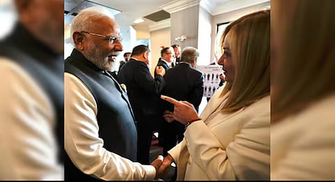 ಪ್ರಧಾನಿ ನರೇಂದ್ರ ಮೋದಿ ಅವರಿಗೆ ಹಸ್ತ ಲಾಘವ ನೀಡಿ ಮಾತನಾಡಿಸಿದ ಜಾರ್ಜಿಯಾ ಮೆಲೋನಿ, ಮೋದಿ ಬಗ್ಗೆ ಮೆಚ್ಚುಗೆಯ ಮಾತನ್ನಾಡಿದ್ದಾರೆ.