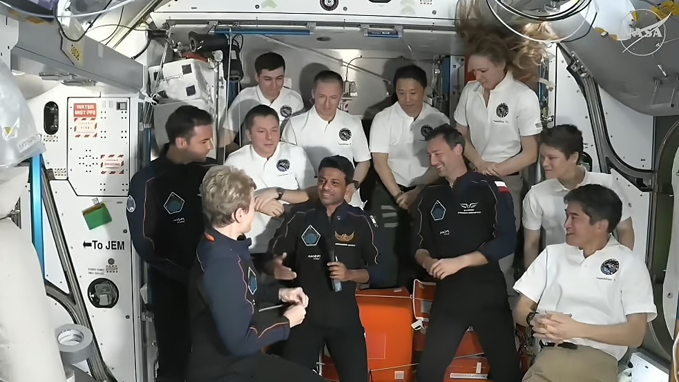ಶುಭಾಂಶು ಶುಕ್ಲಾ ಅವರು ಪ್ರಯಾಣಿಸುತ್ತಿದ್ದ ನೌಕೆ ಅಂತರರಾಷ್ಟ್ರೀಯ ಬಾಹ್ಯಾಕಾಶ ನಿಲ್ದಾಣ (ISS)ದೊಂದಿಗೆ ಡಾಕ್ ಆಗಿ ಹ್ಯಾಚ್ ತೆರೆದಾಗ, ಶುಕ್ಲಾ ಮತ್ತು ಅವರ ತಂಡದ ಇತರೆ ಮೂವರು ಸಹ ಗಗನಯಾತ್ರಿಗಳನ್ನು ಐಎಸ್ಎಸ್ ಸಿಬ್ಬಂದಿ ಅಪ್ಪುಗೆ, ನಗು ಮತ್ತು ಸಾಂಪ್ರದಾಯಿಕ ಬಾಹ್ಯಾಕಾಶ ಪಾನೀಯದೊಂದಿಗೆ ಆತ್ಮೀಯವಾಗಿ ಸ್ವಾಗತಿಸಿದರು.